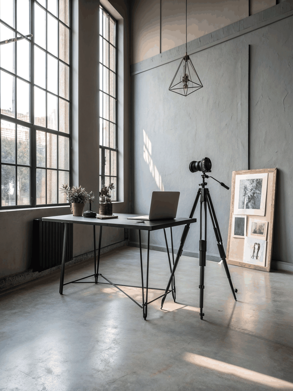 Minimalist concrete tables and ergonomic seating create a brutalist yet comfortable environment for focus.